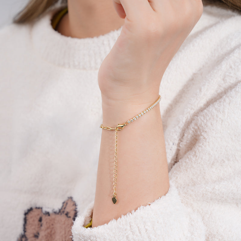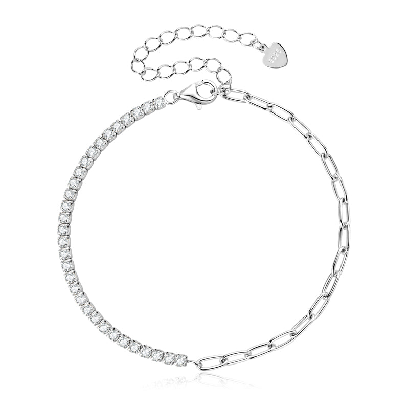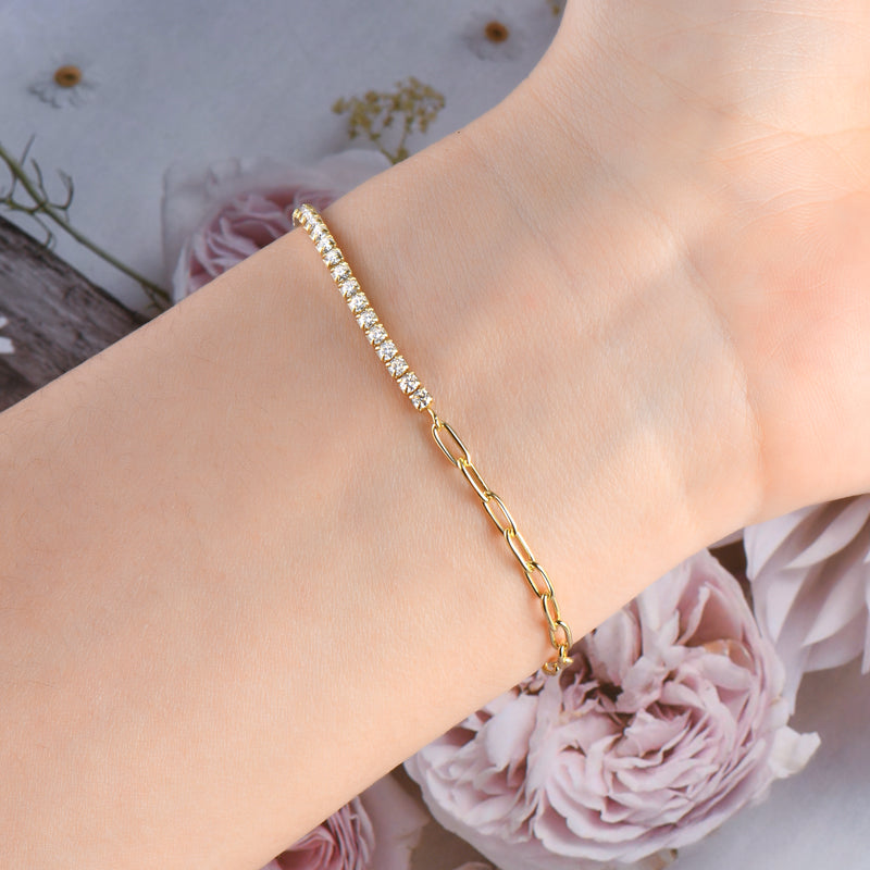 Our Athena bracelet causes envy. Made with half paper clip chain and half real moissanite diamonds, it sparkles and catches attention wherever you go. There are 31 diamonds, and each diamond is 2mm.