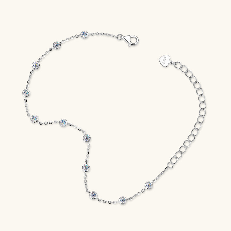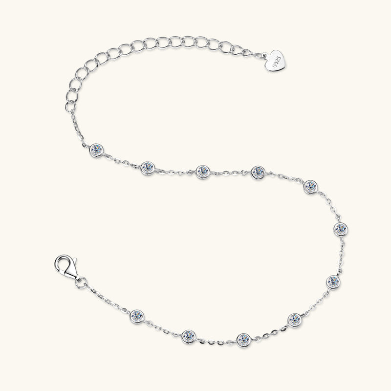 Our elegant Vinci bracelet is made with 11 round real moissanite diamonds in a round setting spaced by a chain. The stone size is 2.5mm each, and total carats is .66ct including all 11 diamonds.