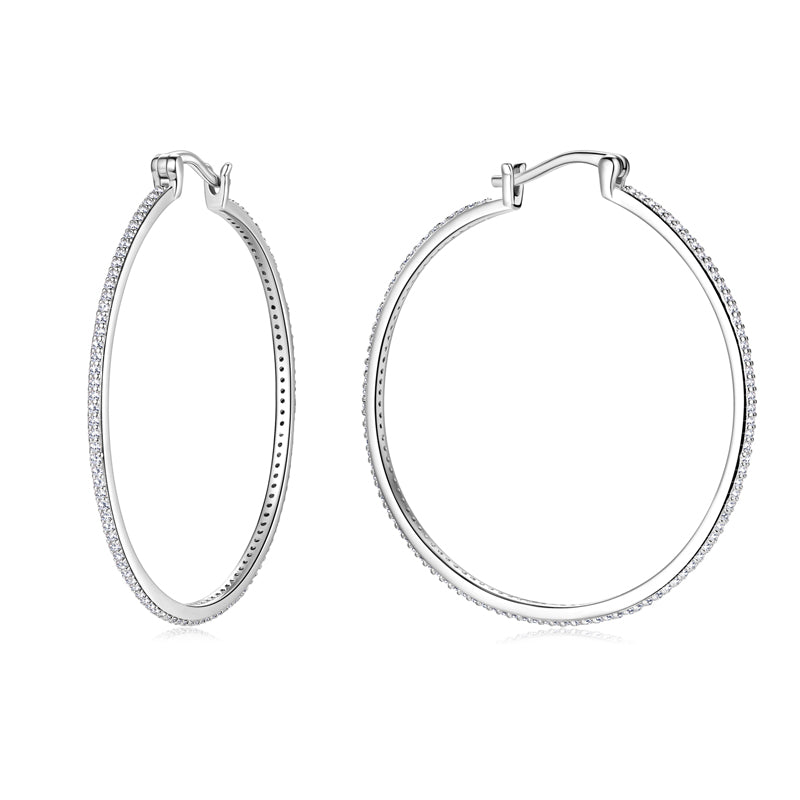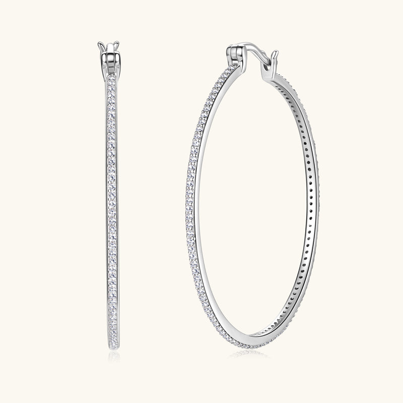 Elevate your look with our FELICITY hoop earrings! Exquisitely crafted with 202 dazzling moissanite diamonds set in lustrous white gold plating over sterling silver.
