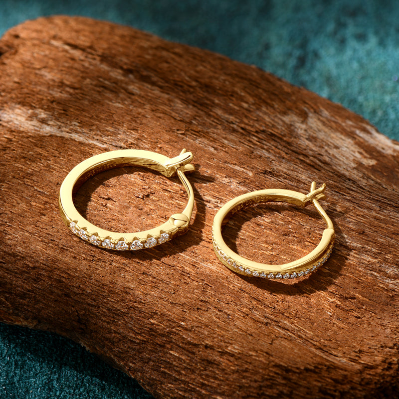 Forty-eight moissanite diamonds line these two beautiful crossover hoops! The total weight of the Hartley earrings comes in at 2 carats. Made with real moissanite diamonds, you can expect these earrings to last forever. Choose from either white gold or yellow gold.
