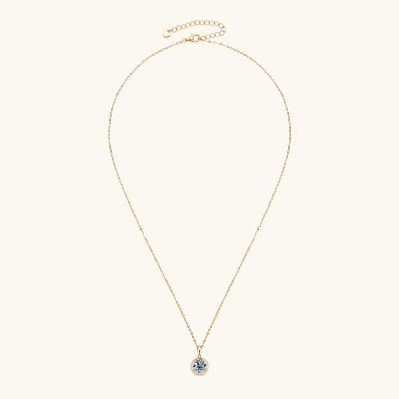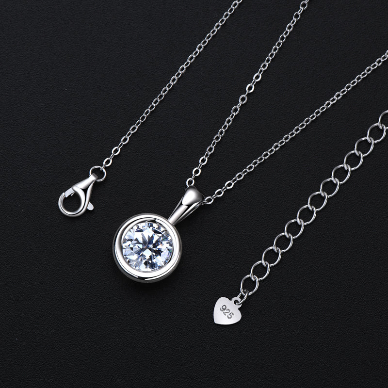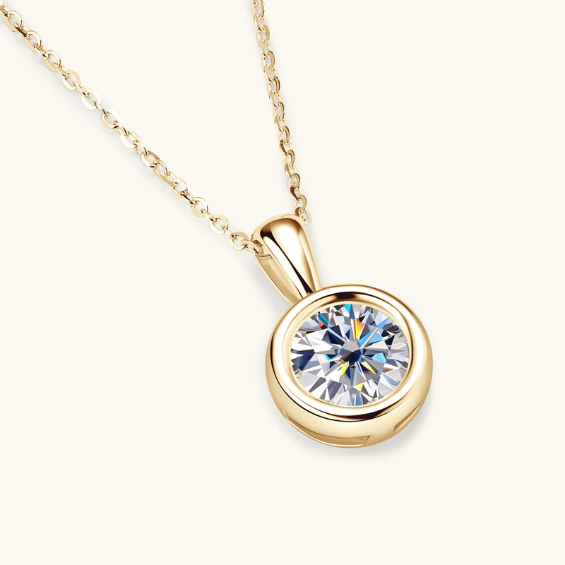 Our stunning Vinci necklace is made with a real 2 carat moissanite diamond in a delicate but bold pendant setting. The base material is sterling silver covered in gold or white gold.