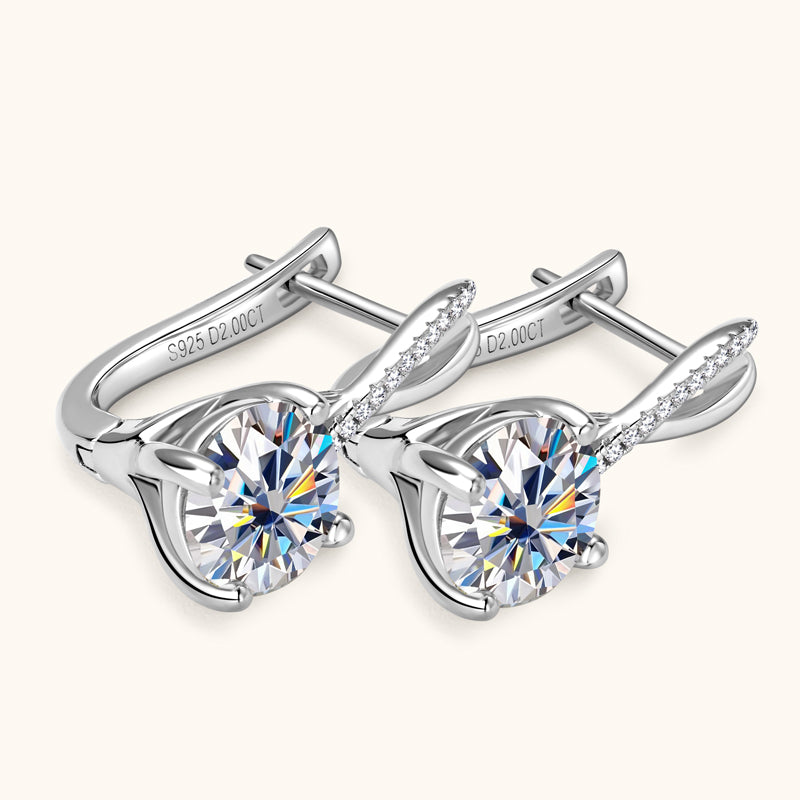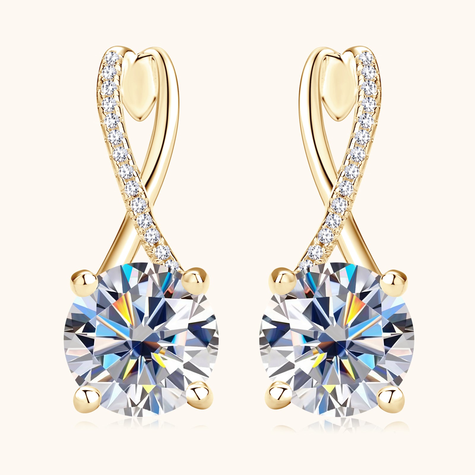 Laced with real moissanite diamonds, our Lexington crossover earrings can be purchased in white gold or yellow gold. 925 sterling silver is used as the base to ensure a solid piece, then plated in yellow gold or white gold. There's a total of 2 carats in diamond weight in this item.