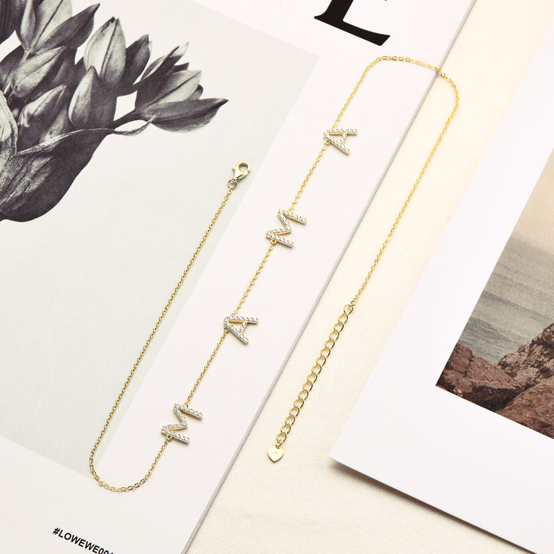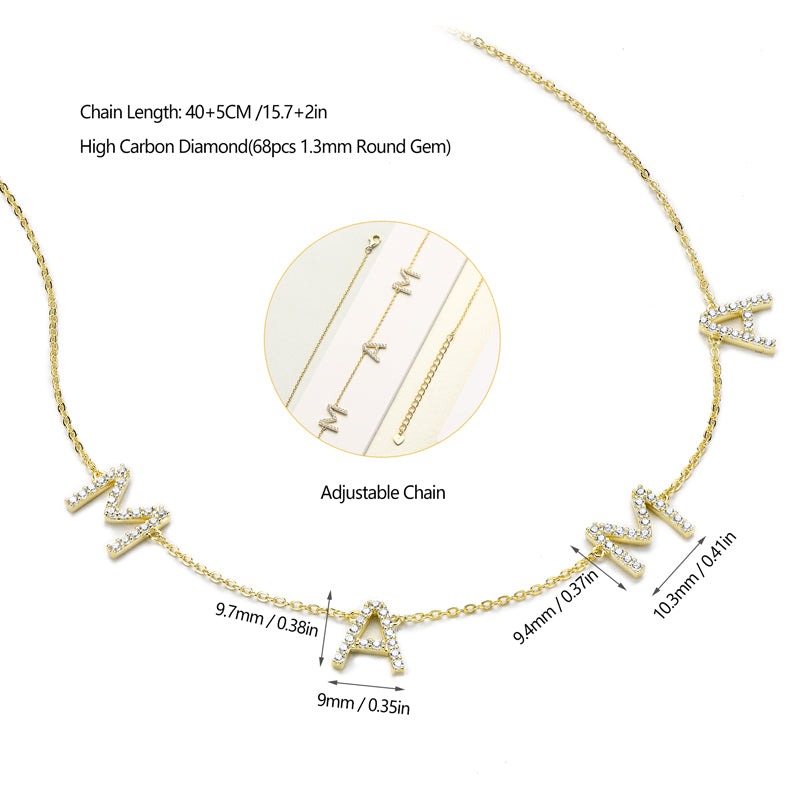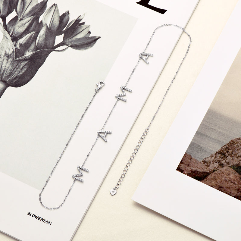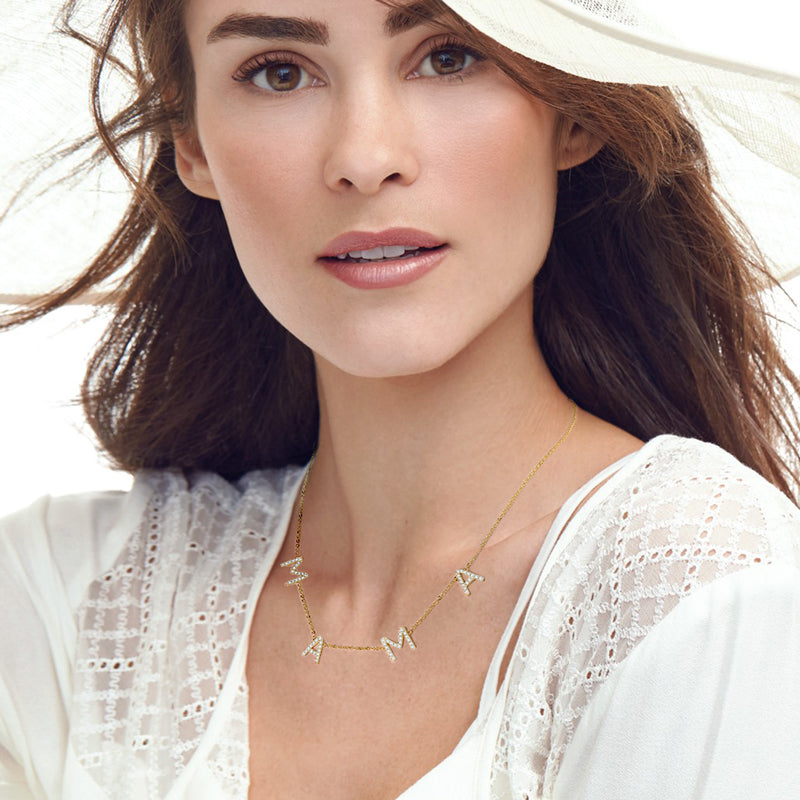 This beautiful necklace has 4 charms, and each letter is lined with zircons, with a total of 68 zircons throughout the necklace. This piece comes in either gold or white gold.