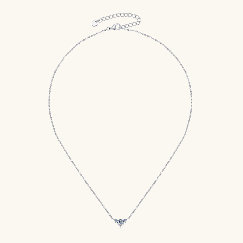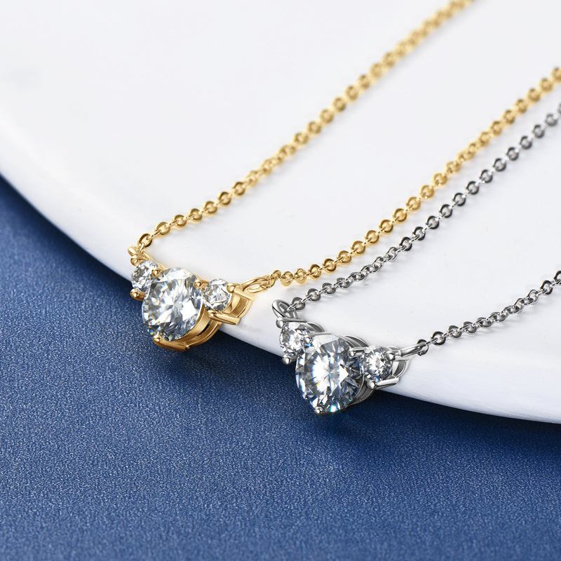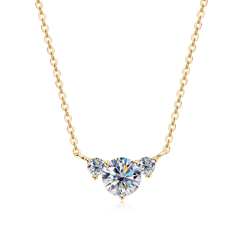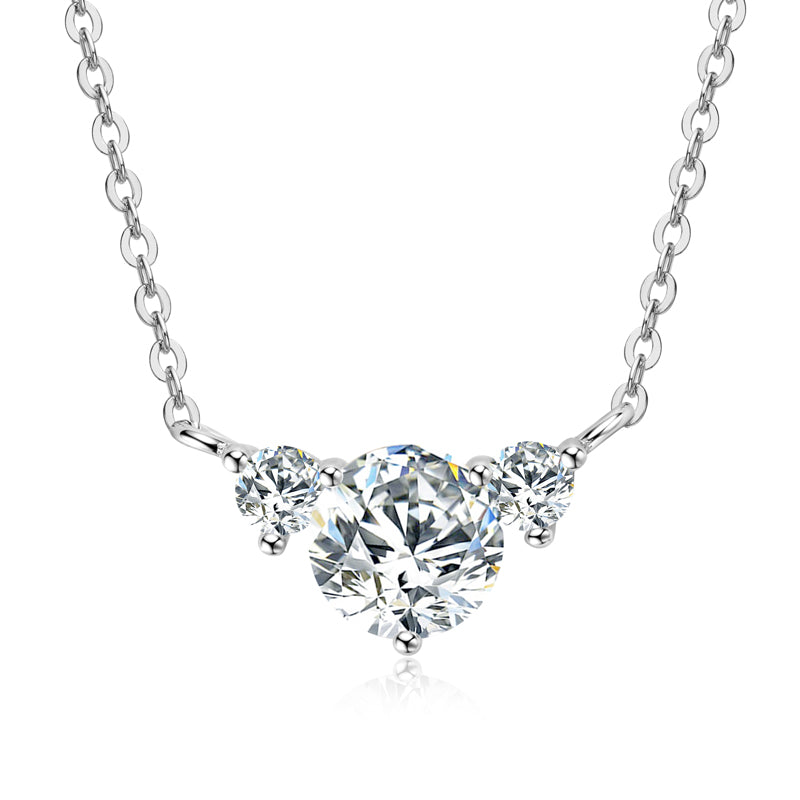 Tiegan is an elegant necklace with three GRA certified moissanite diamonds. The main stone is 1 carat, while the accompanying accent stones are 0.1ct each - for a total carat weight of 1.2ct. The base of this necklace is sterling silver and plated with either white or yellow gold.