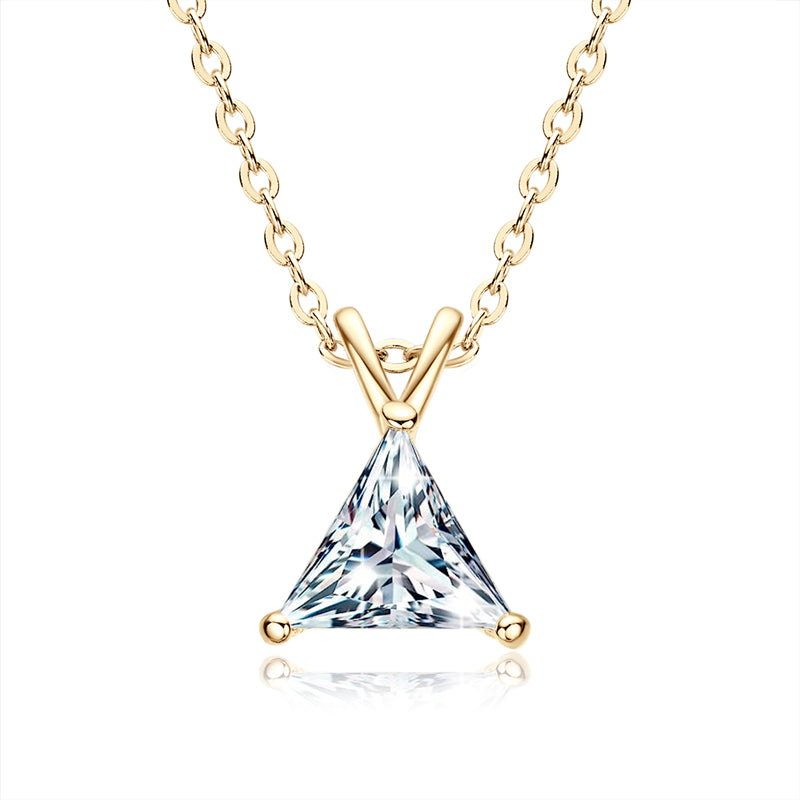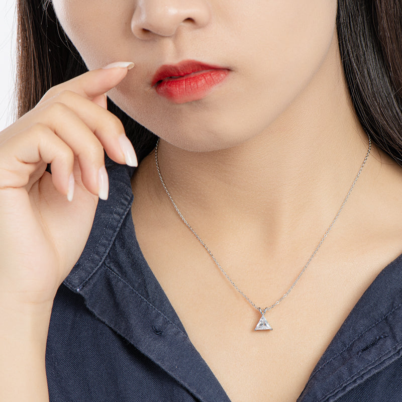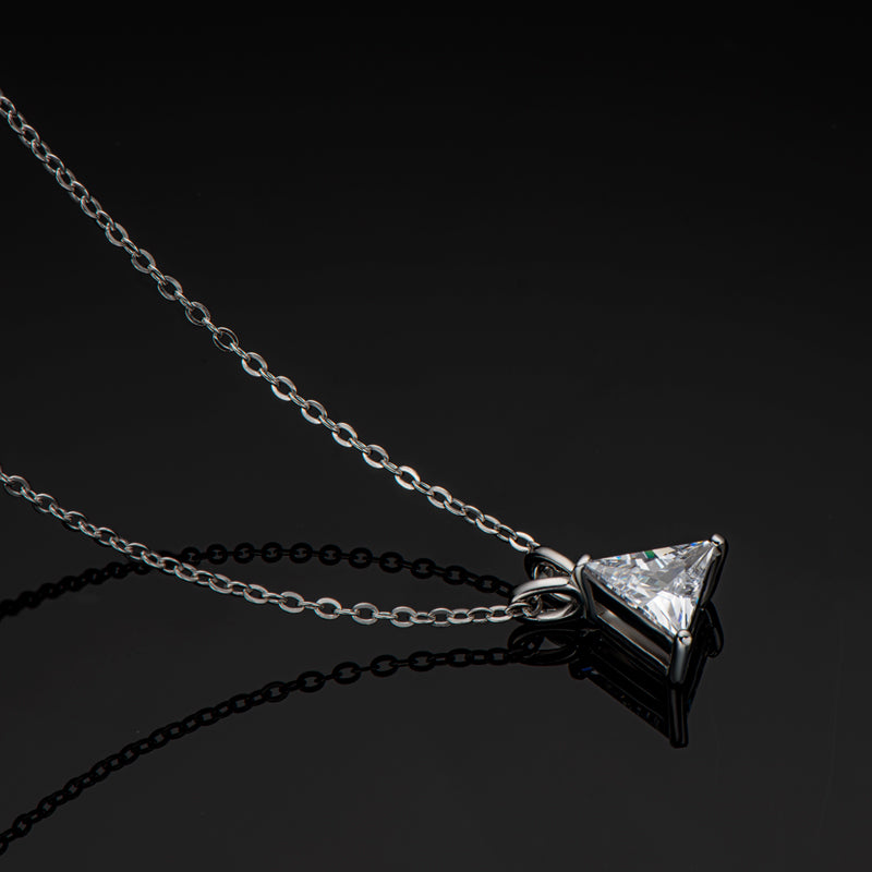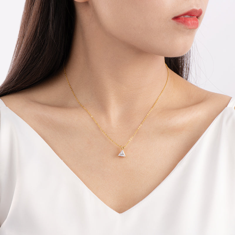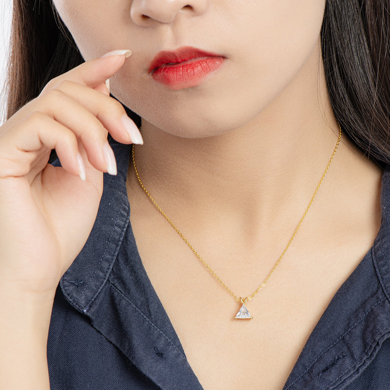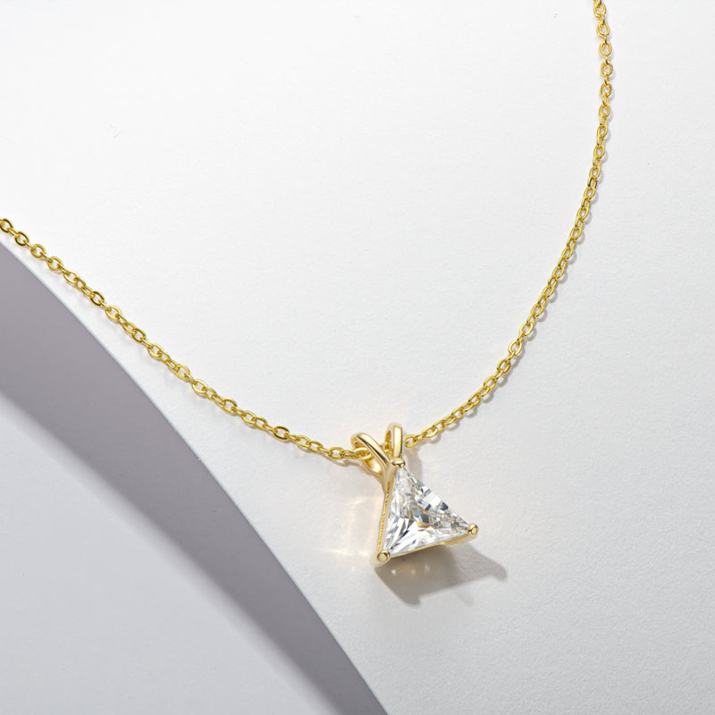 Introducing VIEUX - our exquisite Triangle Diamond Necklace. Available in both gold and white gold, this piece boasts a stunning 1.1 carat zircon triangle pendant on delicately suspended on a sleek chain.